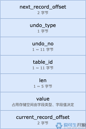 。undo_no,64 位整数,压缩之后占用 1 ~ 11 字节,表示这条 Undo 日志的编号。 table_id,64 位整数,压缩之后占用 1 ~ 11 字节,这个属性值是表 ID,表示事务插入记录到哪个表产生的这条 Undo 日志。 len,32 位整数,压缩之后占用 1 ~ 5 字节,表示主键字段值的长度。 value,占用多少字节的存储空间,取决于主键字段的数据类型和具体值,这个属性中存储的就是主键字段值,存储时不会压缩。 current_record_offset,这条 Undo 日志在 Undo 页中的偏移量。