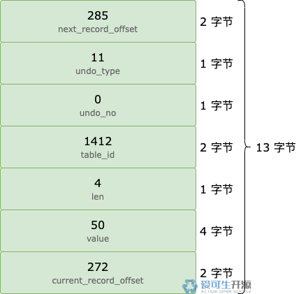 next_record_offset,占用 2 字节,表示下一条 Undo 日志在 Undo 页中的偏移量。 undo_type,占用 1 字节,表示这条 Undo 日志的类型。插入记录产生的 Undo 日志,类型为 TRX_UNDO_INSERT_REC