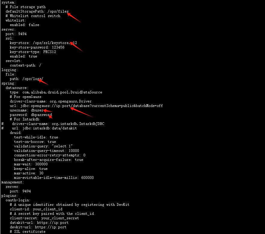 [root@node1 config]# cat application-temp.ymlsystem:# File storage pathdefaultStoragePath: data/Datakit/files# Whitelist control switchwhitelist:enabled: falseserver:port: 9494ssl:key-store: data/Datakit/ssl/keystore.p12key-store-password: 123456key-store-type: PKCS12enabled: trueservlet:context-path: /logging:file:path: /data/Datakit/logs/spring:datasource:type: com.alibaba.druid.pool.DruidDataSource# For openGaussdriver-class-name: org.opengauss.Driverurl: jdbc:opengauss://192.*.*.60:15400/datakitdb?currentSchema=public&batchMode=offusername: datakitpassword: ******# For Intarkdb# driver-class-name: org.intarkdb.IntarkdbJDBC# url: jdbc:intarkdb:data/datakitdruid:test-while-idle: truetest-on-borrow: truevalidation-query: "select 1"validation-query-timeout: 10000connection-error-retry-attempts: 0break-after-acquire-failure: truemax-wait: 300000keep-alive: truemax-active: 30min-evictable-idle-time-millis: 600000management:server:port: 9494plugins:oauth-login:# A unique identifier obtained by registering with DevKitclient-id: your_client_id# A secret key paired with the client_idclient-secret: your_client_secretdatakit-url: https://ip:portdevkit-url: https://ip:port# SSL certificatessl-key: your_ssl_key[root@node1 config]#