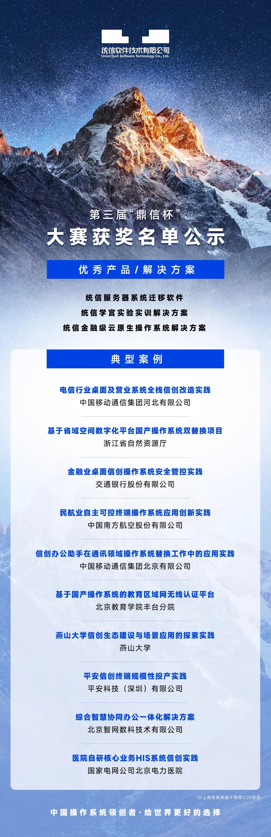 该赛事旨在面向信息技术企业,挖掘一批成熟、好用、具有推广价值的软硬件产品和解决方案;面向行业用户单位,遴选一批场景需求明确、技术特色鲜明、示范成效显著的典型案例。继第二届斩获12项大奖之后,统信软件再次以13项大奖闪耀第三届“鼎信杯”。