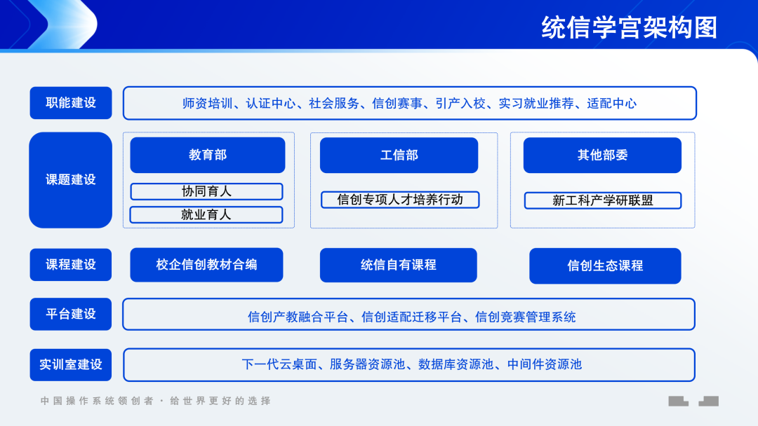 “统信学宫”是统信软件经过多年校企产研合作经验积累,精心打造统信产教融合品牌。在具体实践中,统信软件与合作高校共同设计并实施了一系列针对性强、与产业紧密结合的信创人才培养方案,以国产操作系统为牵引,与教学、科研应用等核心技术内容进行融合,有力促进了高校教育与信创产业需求的无缝对接。