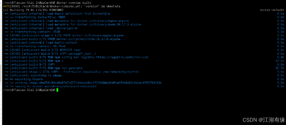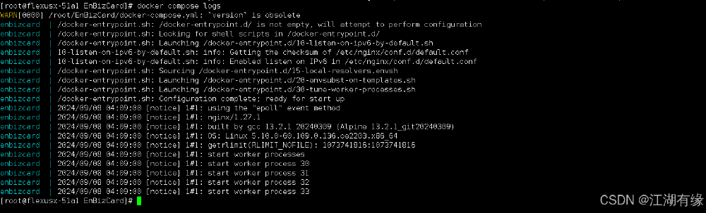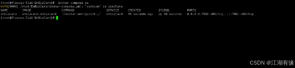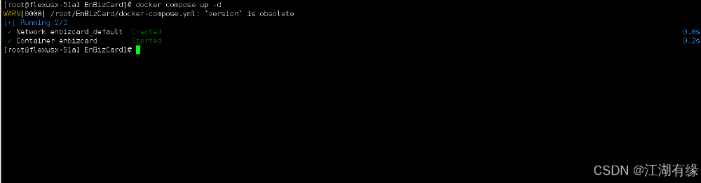 [root@flexusx-51a1 EnBizCard]# docker compose up -dWARN[0000] /root/EnBizCard/docker-compose.yml: `version` is obsolete[+] Running 2/2 ? Network enbizcard_default Created 0.0s ? Container enbizcard Started 0.2s