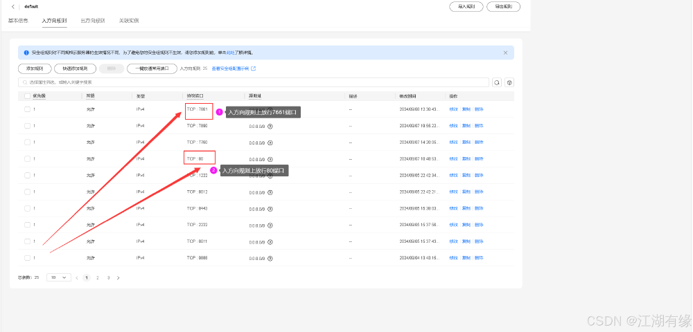 进入 Flexus 云服务器 X 实例控制台,进行安全组规则配置。在安全组入方向规则上,放行 7661 和 80 端口。