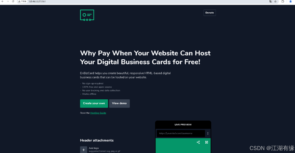 1.本次实践为个人测试学习环境,旨在快速部署应用,生产环境请谨慎;2.本次实践环境为云华为云 Flexus 云服务器 X 实例,使用的操作系统为 openEuler 22.03 LTS;3.本次实践在 Docker 环境下部署 EnBizCard 数字名片工具。
