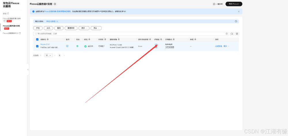 进入华为云 Flexus 云服务的控制台,选择 Flexus 云服务器 X 实例,可以看到已经正在运行的 Flexus 云服务器 X 实例。