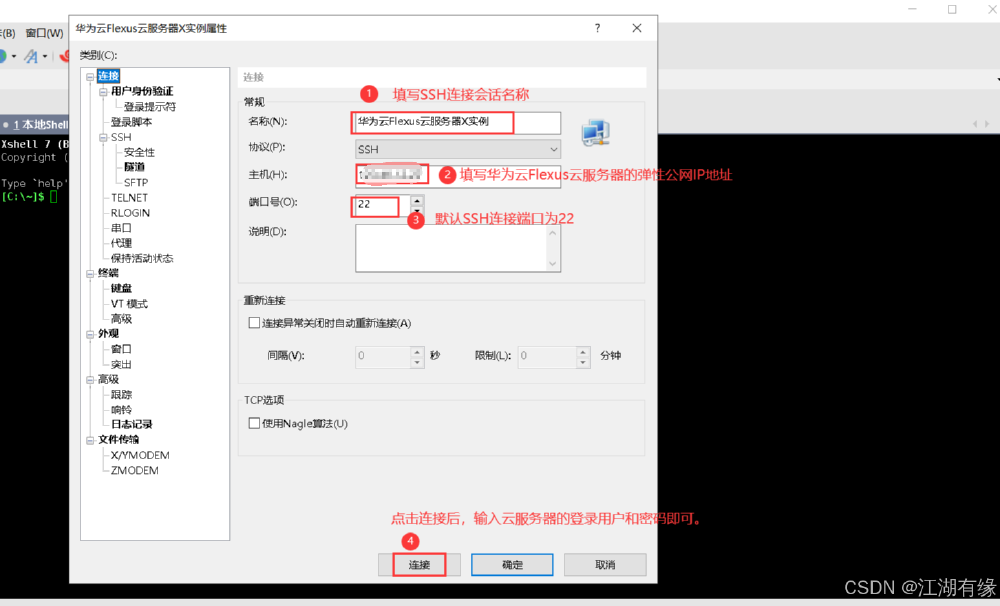 · 主要填写 Flexus 云服务器 X 实例的弹性公网 IP 地址,输入其登录用户和密码,连接即可。