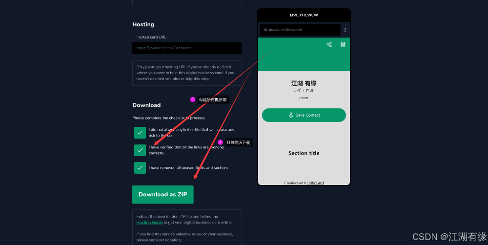 将名片填写信息下拉到最后面,勾选所有提示项,点击下载名片。