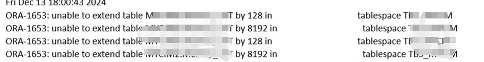 12/13我司某基地MES全厂停线,系统卡死不可用,通知到我排查,查看alert log看到是表空间不足
