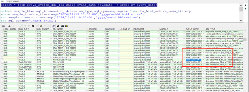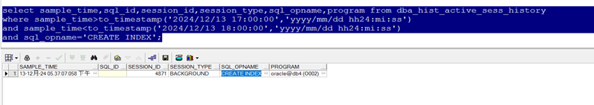 select distinct sql_opname from dba_hist_active_sess_history where sample_time>to_timestamp('2024/12/13 17:00:00','yyyy/mm/dd hh24:mi:ss') and sample_time<to_timestamp('2024/12/13 18:00:00','yyyy/mm/dd hh24:mi:ss');看到除了一个create index外并无异常