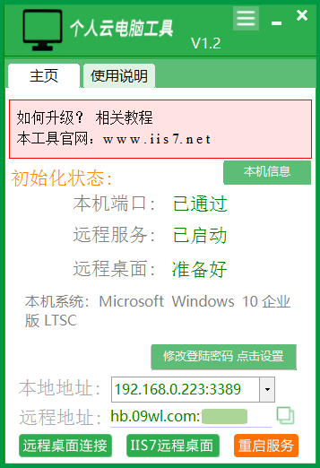 远程电脑安装“个人云电脑工具”之后,会自动生成一个远程地址。如下图所示: