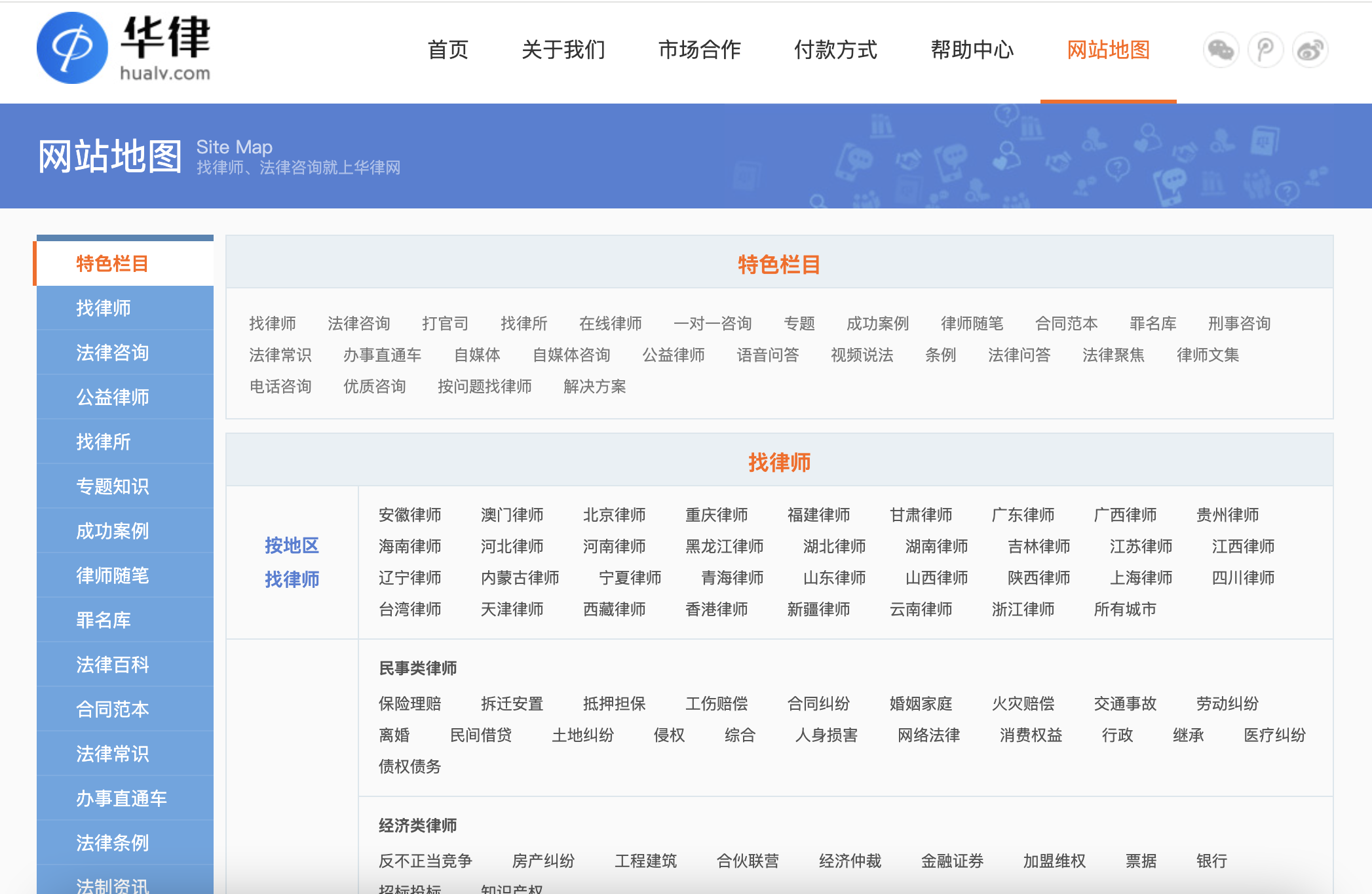 这是一张网站地图,它绘制了华律网上内容的层级结构。左侧是第一层信息,中间是第二层,列表中中是第三层。
