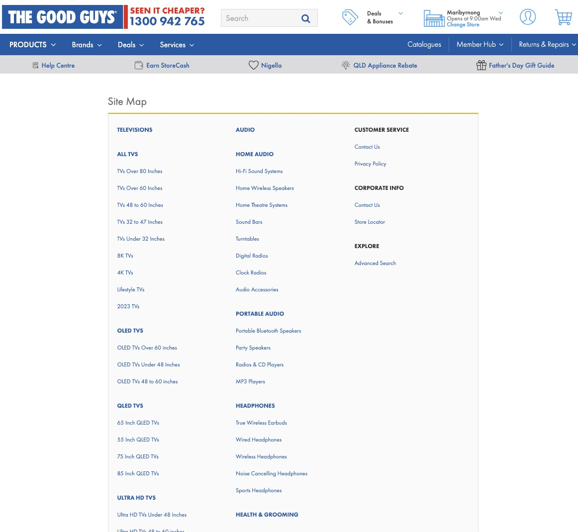 Thegoodguys.com.au:网站地图可从网站页脚中找到,并绘制了指向网站所有产品页面的链接列表。粗体标签表示更高级别的类别。