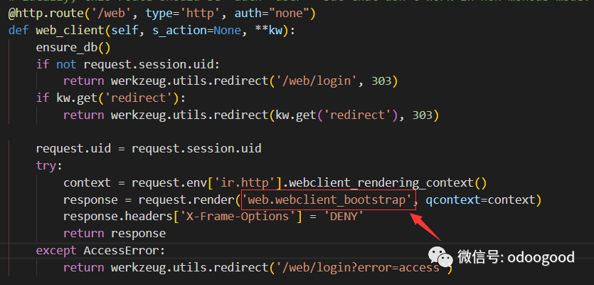 在登入Odoo系统时,会执行到如下的路由控制,前面的选择数据库、登录我们就跳过了,直接看下面关键,系统会渲染模板'web.webclient_bootstrap'到前端显示,于是我们就去web模块中找到这个名称的模板。