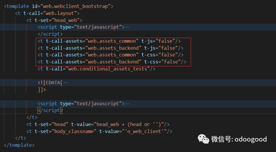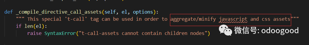 这四个模版都正常的html语法,加载js、css等资源文件。然后我们根据前面的渲染方法,顺藤摸瓜找到odoo\addons\base\models\ir_qweb.py中,如下图所示的处理方法,该方法是专用处理t-call-assets属性标签的。