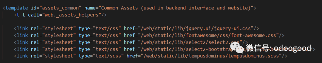 这里分别加载了四个不同类型的资源文件,两个js,两个css。其中这里用到了一个特殊的qweb属性t-call-assets,这个属性表示将后面名称对应的模板进行汇总/压缩。其中web.assets_开头的四个名称在这个xml中也可以找到,我们随便找一个看看,大致内容如下图: