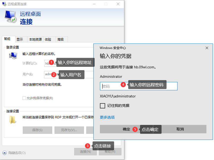 其次,电脑B上找到mstsc(电脑左下角,点击搜索,输入“mstsc”即可调出此页面),输入电脑A上得到的远程地址和用户名,点连接,之后在新的对话框输入A的密码,点击确认,如图所示: