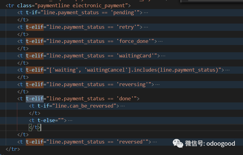上图首先根据payment_status的不同状态进行了不同的处理,然后当payment_status为done时,又嵌套了一个t-if和t-else来进行不同的处理,一般在嵌套时,为了区分代码块的层次,这里会用到<t>元素来进行区分。