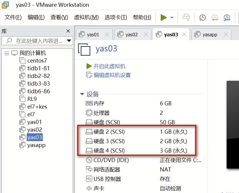 本文测试环境虚拟化软件为 VMware Workstation 17 Pro,停止虚拟机后,添加三块共享磁盘(sdb, sdc, sdd)。