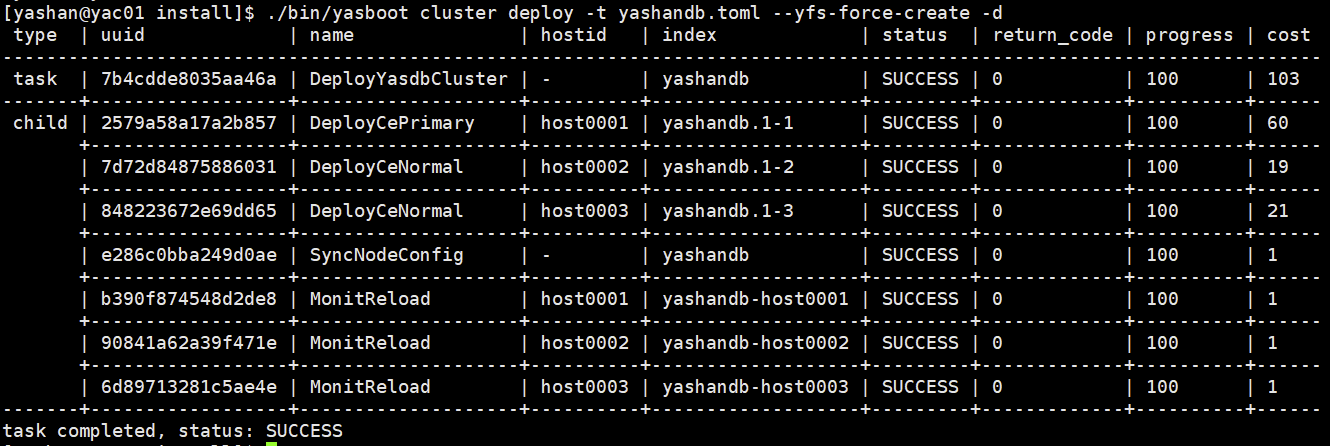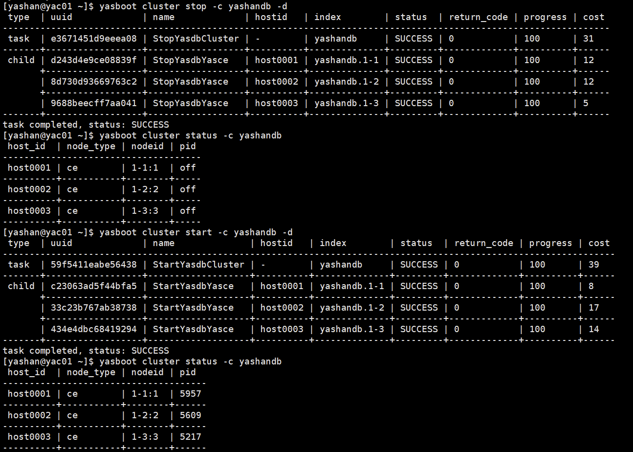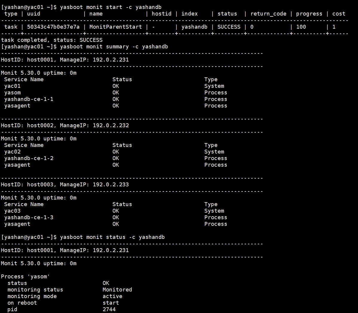 yasboot monit summary查看监控状态简略信息。 - 执行命令
