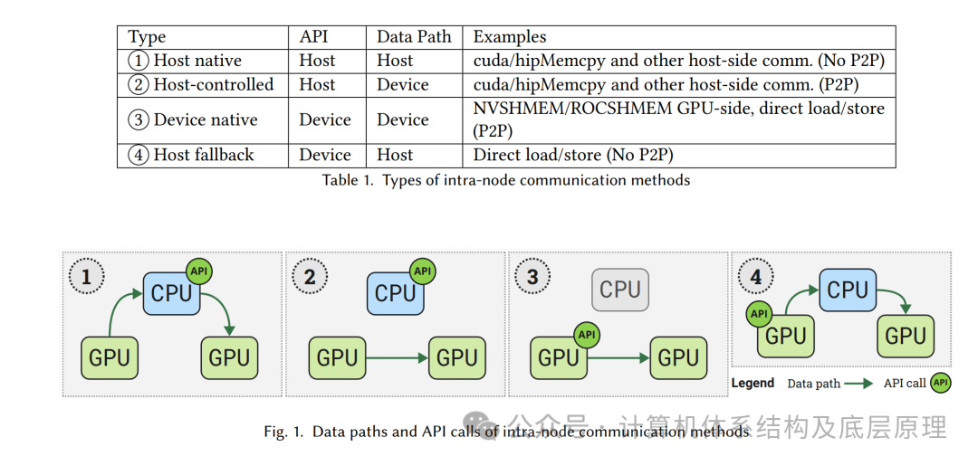 表1和图1展示了节点内(Intra-node) 通信机制的分类示例,以及描绘数据路径的图示