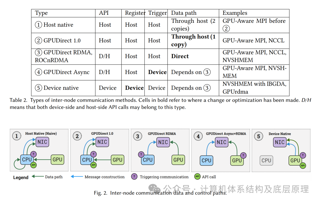 我们在分类节点间通信时识别了五个主要类别。如表2和图2所示,随着通信调用的更多组件移到GPU端,数据传输路径中所需的数据拷贝次数也减少了。多年来,通信方法和相应的技术展示了数据传输和通信控制的优化,这些将在第3节中讨论。首先,完全由CPU端处理的通信方法(1)是可用的,后来通过移除CPU-GPU和CPU-NIC缓冲区之间的额外拷贝,改进为方法(2)。之后,GPU端的优化使得NIC能够直接访问GPU内存-方法(3),最小化了它们之间的数据路径。方法(4)代表了GPU触发的通信技术,如GPUDirect Async和GPU-TN,其中GPU能够发起通信,前提是CPU提前准备好了网卡上的数据包。方法(5)将数据包准备和与网卡的交互完全移交给GPU,使得设备原生通信成为可能。