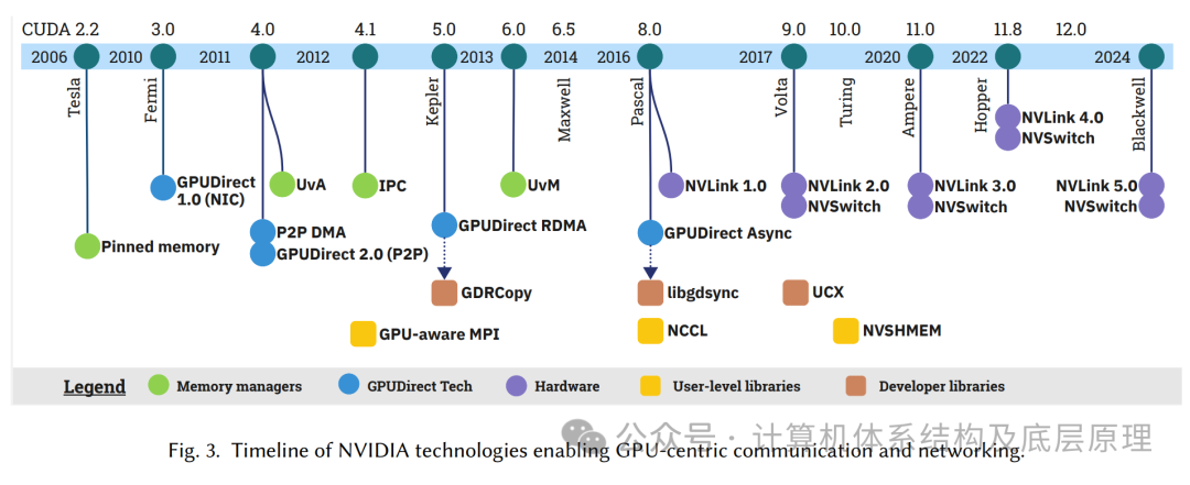 图3总结了NVIDIA提供的技术,详细列出了它们的时间线和可用性。这些技术分为四类:内存管理器、GPUDirect技术、硬件和库。接下来,我们将介绍内存管理机制和GPUDirect技术,随后是作为先驱的硬件支持,这些硬件最终使这些通信方法成为可能。这些技术构成了更高级GPU中心库的基础,这将在第4节中进行讨论。
