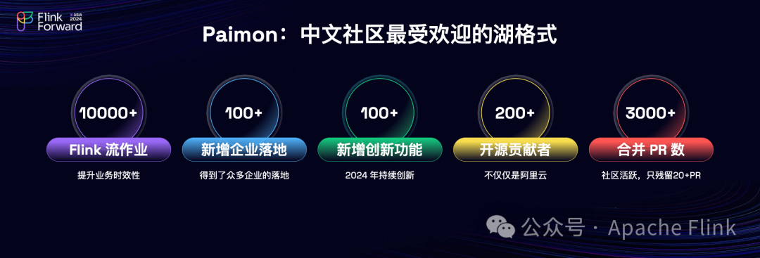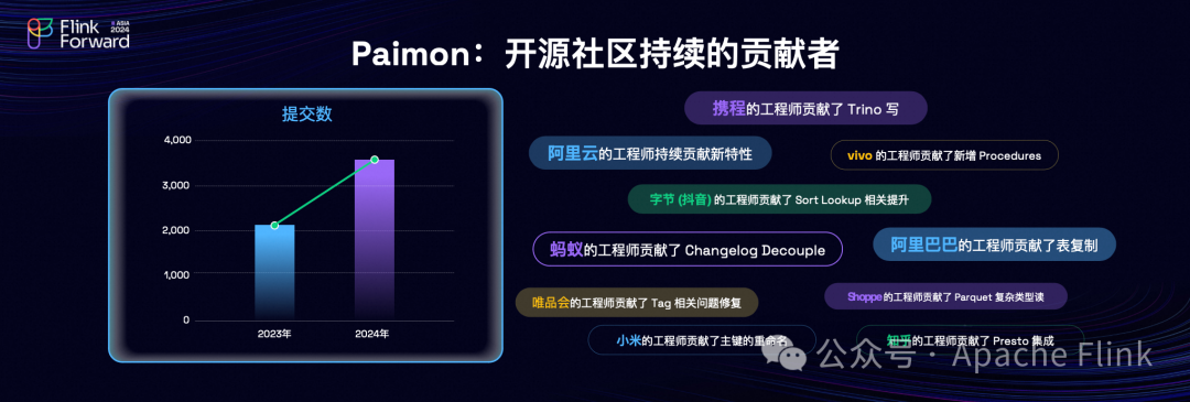 Paimon 在过去一年里经历了显著的发展,成为中文社区中最受欢迎的湖格式存储系统。它被广泛应用于各企业中,尤其是与上万个Flink流作业结合使用,以提高业务处理的时效性。此外,新增了数百家企业开始采用 Paimon 技术,技术持续创新增加了100多项新功能,并吸引了超过200位贡献者参与到开源项目中来,共同推动 Paimon 的进步。至今为止,Paimon 已收到超过3000份 PR,显示出极高的社区活跃度。当前仅剩下20多个未解决的 PR,可以表明项目的维护和发展效率是非常高的。