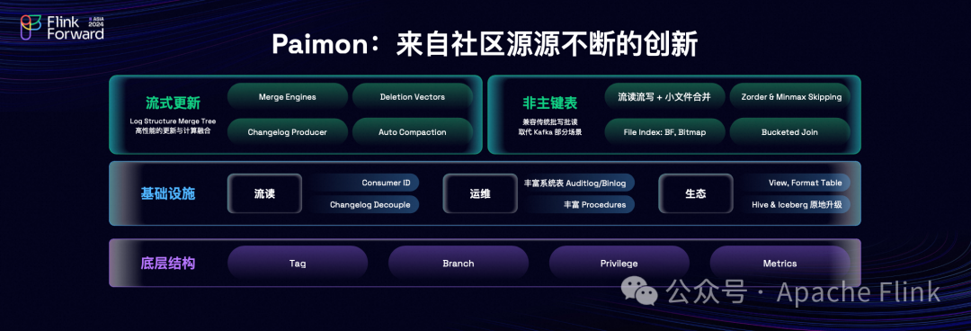 · 主键表:结合了 LSM(Log-Structured Merge Tree)树结构,支持高效的数据更新与计算,并通过 Merge Engines 自定义数据合并逻辑。此外,还利用 Deletion Vectors 加速查询过程,并且具有自动压缩功能及 Changelog Producer 机制。· 非主键表:创新性地实现了流式读写与小文件合并技术、Zorder & Minmax 索引跳过策略、以及 BF (Bloom Filter) 和 Bitmap 等文件索引方式来优化性能;同时也支持 Bucketed Join 以提高 join 操作效率。基础设施: