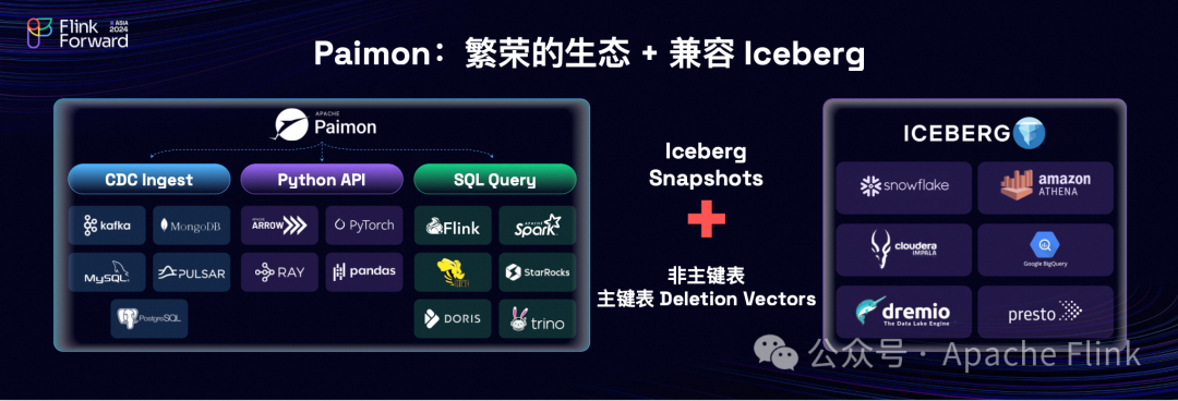 Paimon 是一个支持多种安全引擎的数据湖存储系统,它不仅拥有丰富的上下游 CDC 集成能力,还支持通过 Flink CDC 进行数据同步。除了 CDC 和 SQL 查询功能外,Paimon 也提供了 Python API 的支持,在新版本中进一步增强了与 Python 生态系统的兼容性。为了更好地融入全球范围内的不同计算环境,比如北美地区的 Snowflake、AWS Athena、BigQuery 等平台,Paimon 1.0 版本引入了生成 Iceberg 快照的功能,使得这些外部计算引擎能够通过 Iceberg 协议访问 Paimon 表,从而促进了更广泛的生态系统间的互操作性和数据共享。