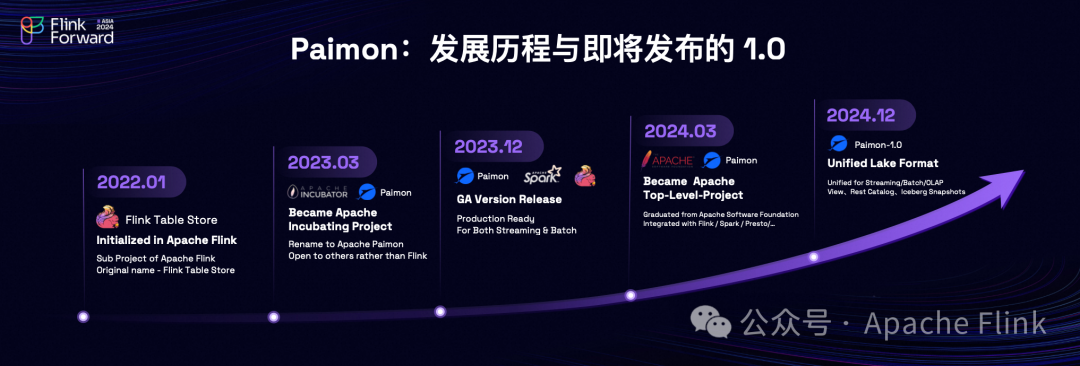 Paimon 最初是作为 Flink Table Store 项目而诞生的,旨在提供一种高效的数据存储解决方案。2022年3月,Flink 社区决定将 Paimon 捐赠给 Apache 软件基金会,以促进其更广泛地被采用和发展。到了2023年12月,Paimon 发布了首个正式可用版本,标志着该项目达到了一个重要的里程碑。紧接着,在2024年的3月份,Paimon 成功从孵化状态毕业,晋升为 Apache 顶级项目之一,这反映了它在技术和社区建设方面取得了显著成就。再到计划于12月发布的 Paimon 1.0 版本,该版本将进一步强化其作为统一湖格式(Unified Lake Format)的地位,为用户提供更加完善的功能支持和服务。