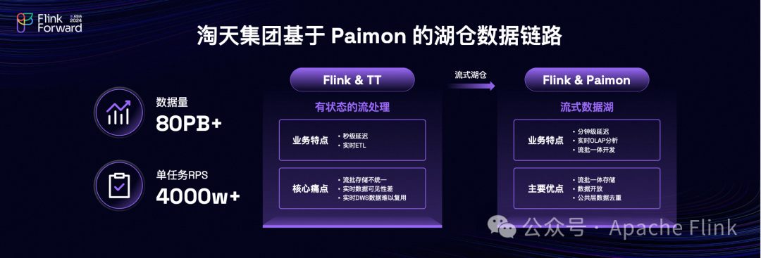 今年以来不管是业务方还是 BI 的实时数据场景都增多了,还有基于实时数据做 OLAP 分析的场景也在增多,这对我们的开发效率提出了一个很大的挑战。基于此我们开始使用 Paimon 做流批存储的中间层,在我们今年的618大促、99大促和双十一大促,都做了一个稳定性的验证,顺利通过了这些大促。目前公共层和应用层总共的数据存储大概是80PB+,单任务基于压测和线上的数据,目前是4000万RPS+。