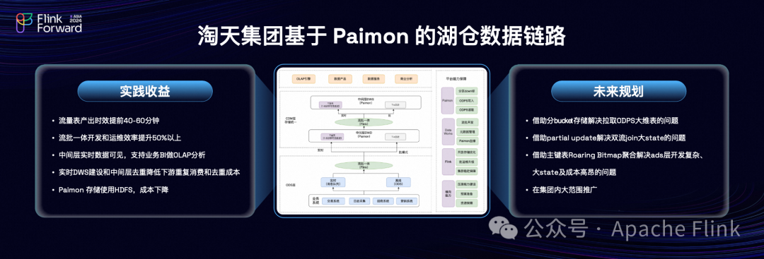 所以我们基于 Paimon,主要的应用是在公共层,我们把淘天的公共层用 Flink+Paimon 重新搭了一遍。今年以来和爱橙团队、之信 (李劲松) 老师这边的团队也有很多合作,我们也做了很多 Paimon 数据开放还有保障性相关的工作,大家可以看到右边比如说我们做了一些 Paimon 的 down 标、Paimon 和离线 OBPS 读取和写入的打通,开发数据上做了一些流批的开发,元数据的管理。Flink 这边做了一些开放存储的优化,可以提高批读的速度。还有一些运维的升级和集团稳定性的保障。