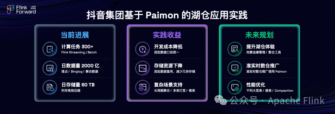首先我们希望去提升湖仓的使用体验,在传统离线数仓里面,数据血缘以及相关运维工具都是比较完善的,而在流式湖仓建设中,因为现在相对比较新,所以相关的工具还是比较欠缺的,我们希望进一步从工具的层面上去提升用户使用上的体验。其次是我们希望在近实时数仓的场景中进一步推广 Apache Paimon,因为 Apache Paimon 跟 Flink 结合是最紧密的,Flink 现在最新的特性在 Apache Paimon 中都可以很快进行适配,因此在近时数仓上面去选择 Apache Paimon 作为流批一体存储是比较适合的。最后是我们希望去做一些性能上的优化,这主要在一些特定的场景下,比如千列大宽表以及 TB 级大维表的场景下,我们看到目前 Apache Paimon 是有一些性能瓶颈的,所以我们希望进一步去优化它,从而在更复杂的场景中去进行应用。