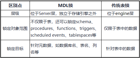 而TABLE, FUNCTION, PROCEDURE, TRIGGER,EVENT, USER_LEVEL_LOCK(用于user-level的锁, GET_LOCK(), RELEASE_LOCK()等函数), LOCKING_SERVICE(用于locking service), SRID(空间参照系统), ACL_CACHE ACL(access-control list缓存), COLUMN_STATISTICS属于object lock。