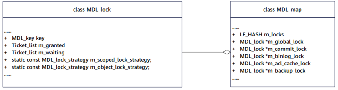 MDL_lock对象被统一保存在全局的MDL_map mdl_locks中,每个MDL_lock实例由MDL_key、两个Ticket_list、MDL_lock_strategy组成。其中,两个Ticket_list分别为m_granted和m_waiting,用于存储已获取和正在等待的MDL_ticket。
