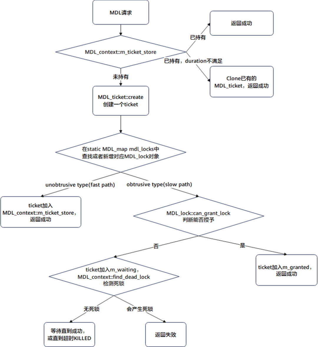 MDL_context::acquire_lock|-MDL_context::try_acquire_lock_impl() // 尝试获取锁,如果成功,直接返回|-MDL_context::find_deadlock() // 死锁检测|-等待获取锁|-异常处理逻辑|-获取成功,保存MDL ticket