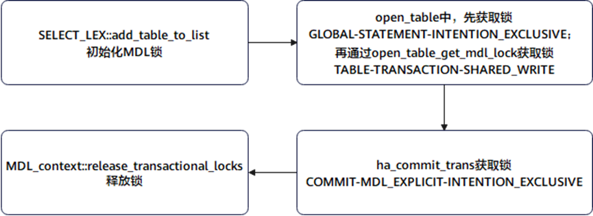 下面分别以SELECT语句和INSERT/UPDATE/DELETE语句为例,分析执行流程中MDL的申请释放。