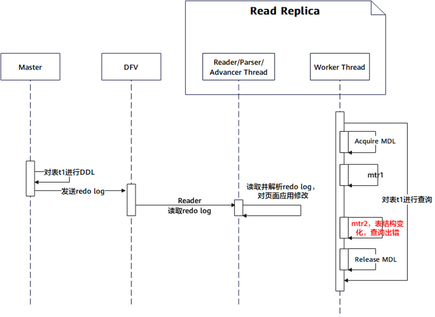如图6所示,当TaurusDB的备机正在执行的查询涉及的表被主机修改了表结构或直接drop时,会产生冲突。针对类似这种场景,需要将主机DDL时涉及的MDL操作同步到备机,以解决上述问题。