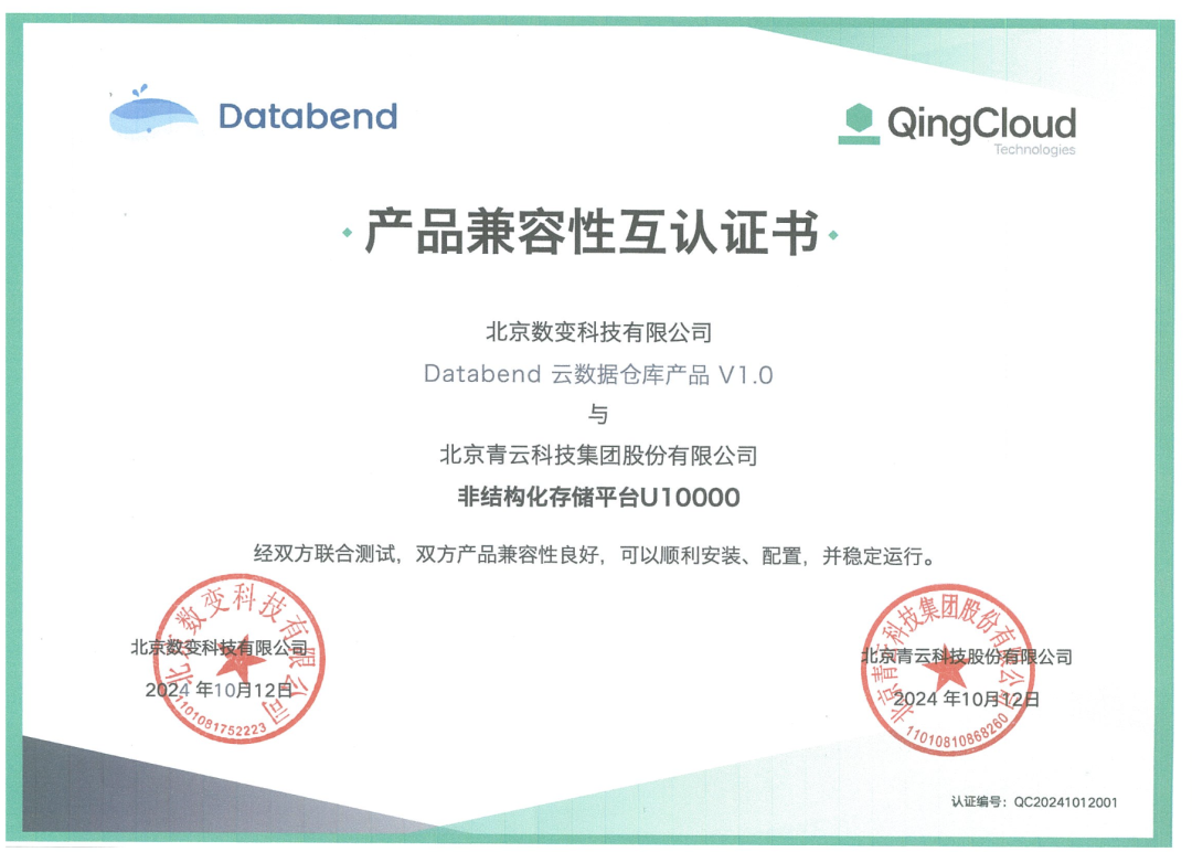 ● 弹性扩展与高性能:U10000 对象存储可以轻松扩展到数百 PB 甚至 EB 的数据量,而 Databend 实现了真正的存储、计算分离架构,支持弹性扩展和成本高效的资源管理,提升分布式计算能力。此外,Databend 提供多种索引机制、数据缓存与压缩功能,进一步加速数据访问速度和效率。