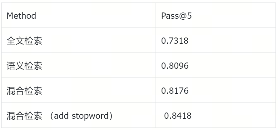除了基于个例的微观质量分析外,我们还通过整体评估得出了定量结果,统计了数据集中的Pass@5指标。该指标用于衡量每个查询的Top 5结果中,成功检索到的相关结果占所有相关结果的比例。从这个结果我们可以看出基于先进的embedding模型本身可以达到一个良好的基线效果,但是通过与全文检索方法依然可以带来提升,而通过对于bm25结果进行观察,针对具体场景进行参数调整,可以带来更大的提升。