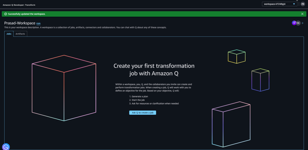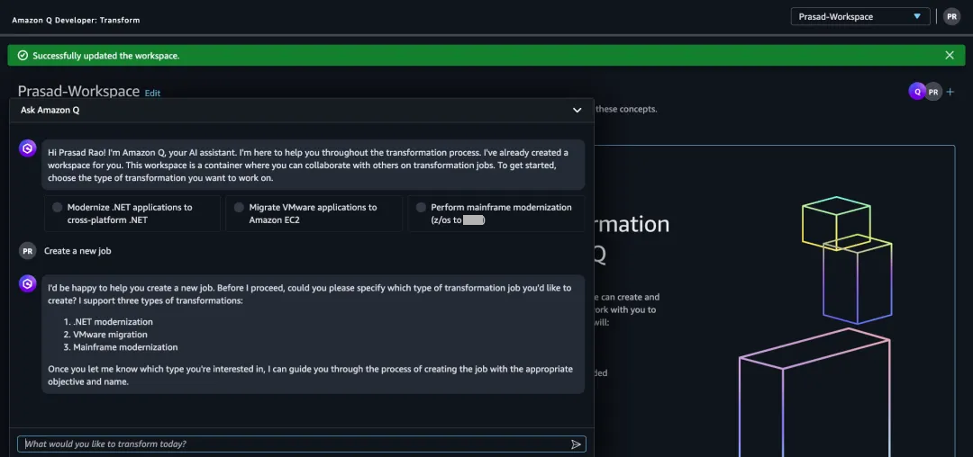 使用凭证登录Web体验并创建一个新的工作区,随后将收到一个提示使用Amazon Q Developer创建转换任务的页面。