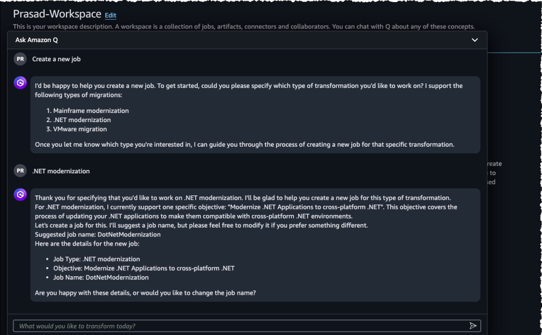 首先,让Amazon Q Developer为.NET现代化创建一个任务。