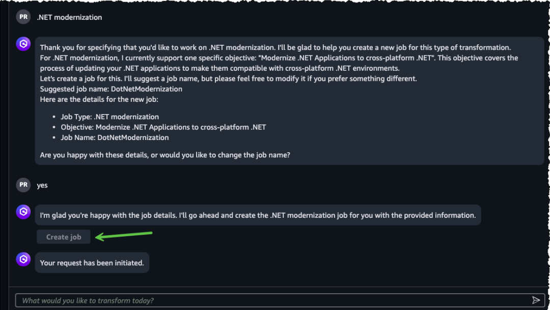 Amazon Q Developer为.NET现代化任务提供了一个默认名称,并询问用户是否需要在创建任务之前更改名称。您可以选择继续使用默认名称,并选择“Create job”。