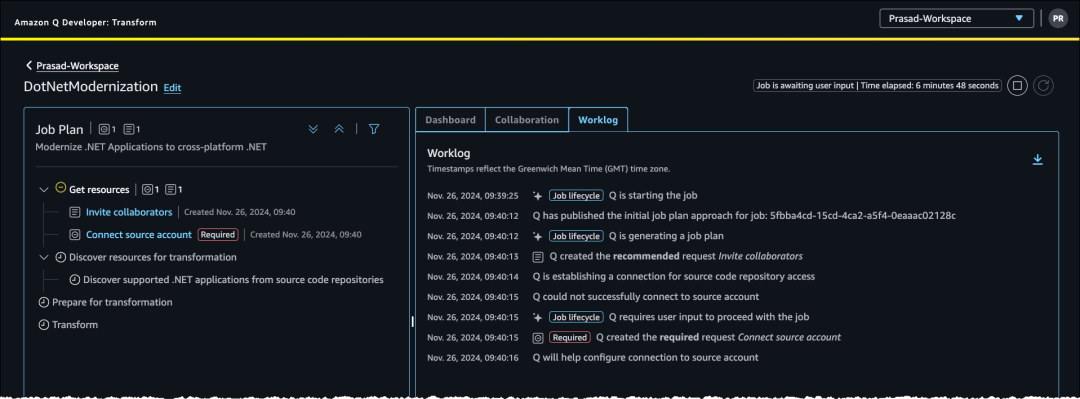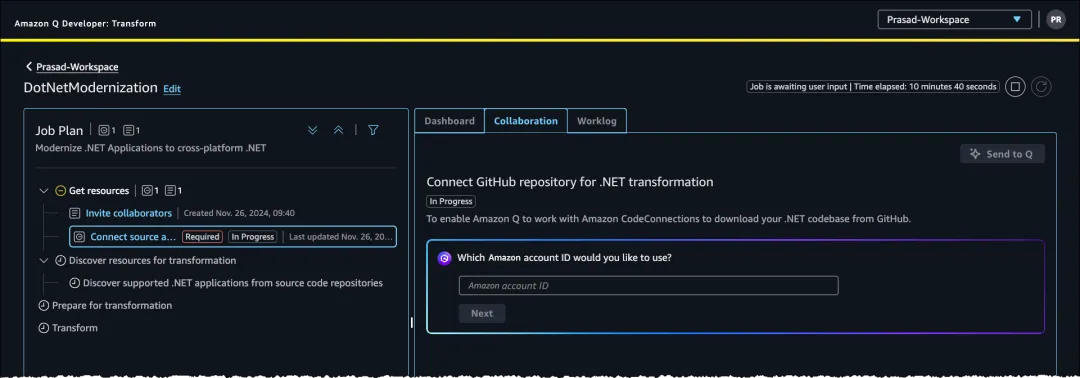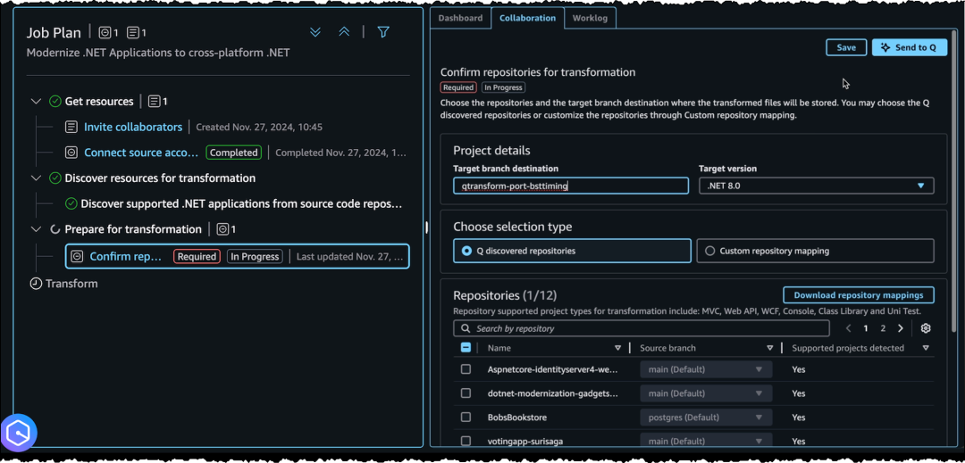 连接源代码存储库后,Amazon Q Developer会发现受支持的.NET应用程序。接着,它会通过向用户请求提供特定输入(如选择目标.NET版本和需要转换的存储库)来为转换过程做准备。