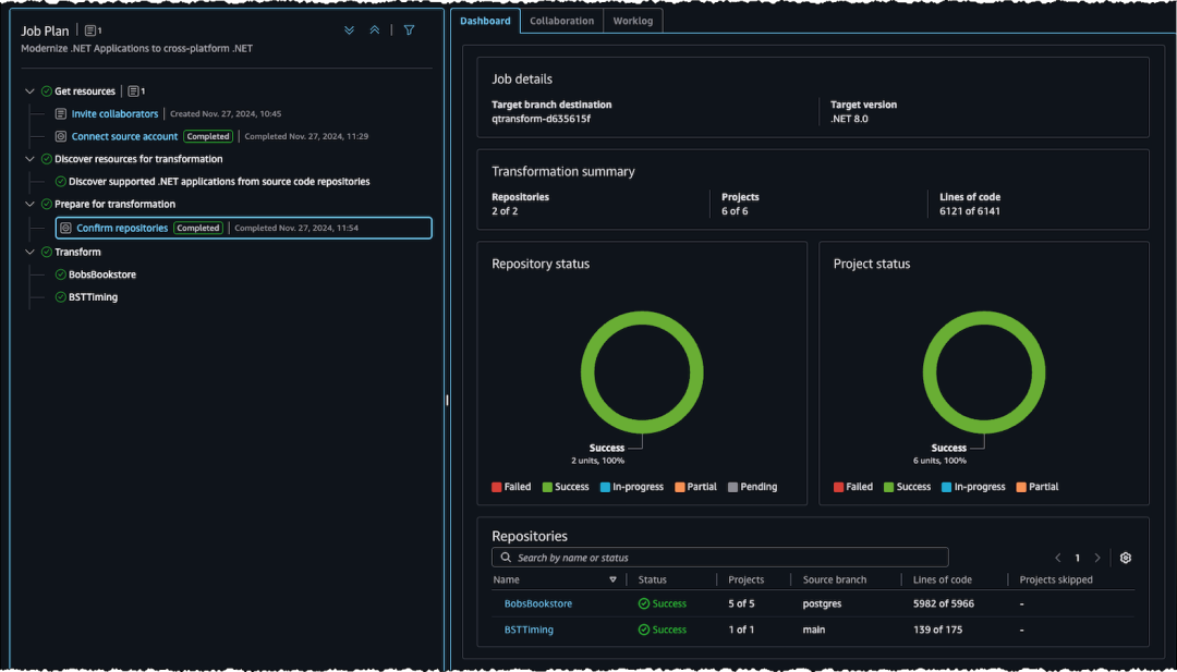 Amazon Q Developer会自动将您选定的.NET应用程序迁移到目标版本,并在任务完成后将转换后的代码提交到存储库的一个新分支,同时保留原始源代码。您可以在仪表板上监控转换进度。