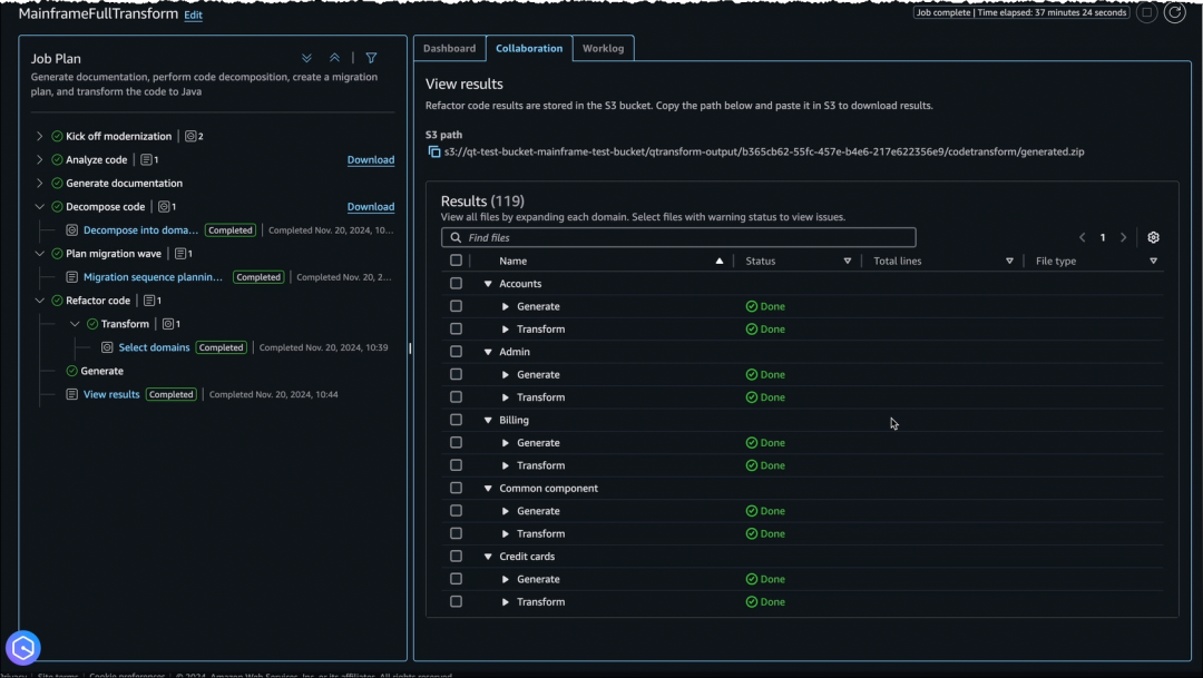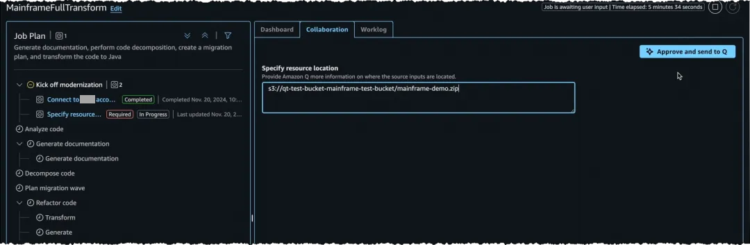 获得批准后,Amazon Q Developer会自动将COBOL代码重构为Java代码,并在需要输入时发出提示,同时提供状态更新以便跟踪。
