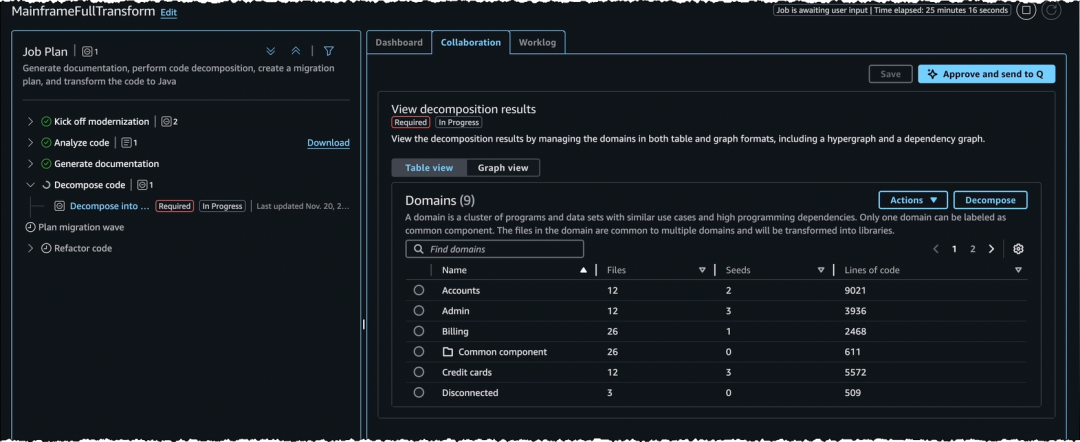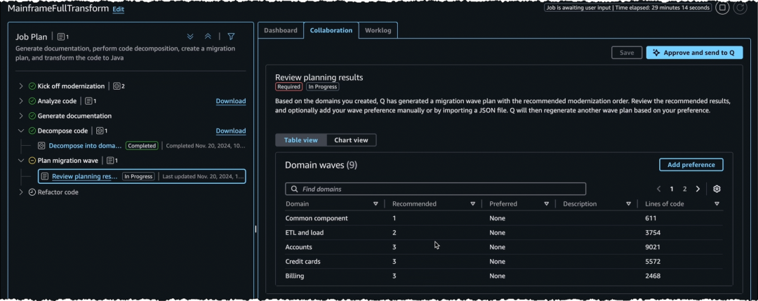 然后,Amazon Q Developer利用内置的大型机和云领域专业知识,提出一个迁移波次计划,您可以对其进行审查、更新和批准。