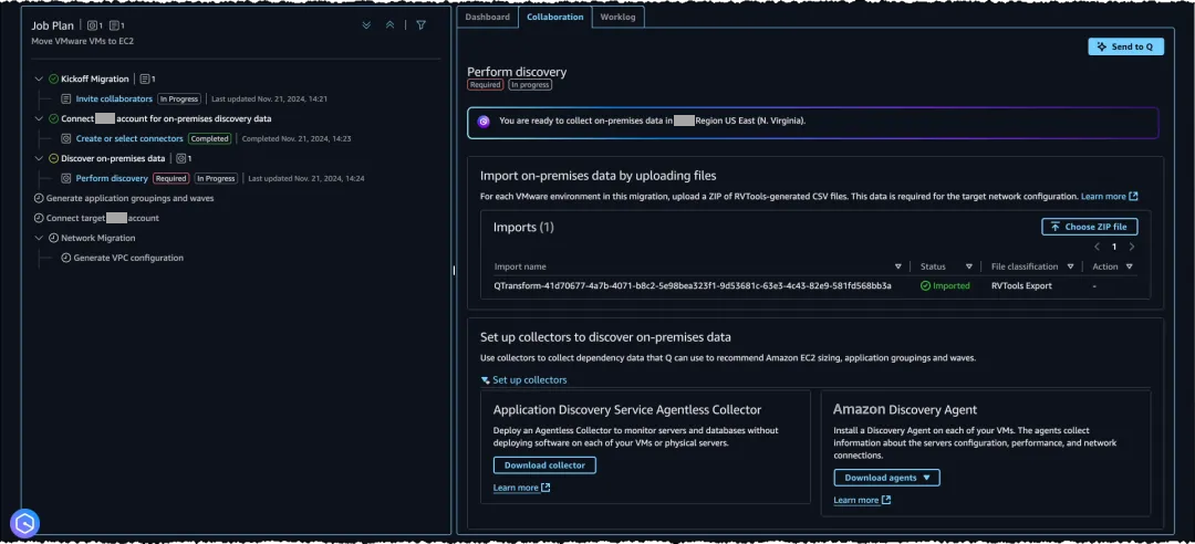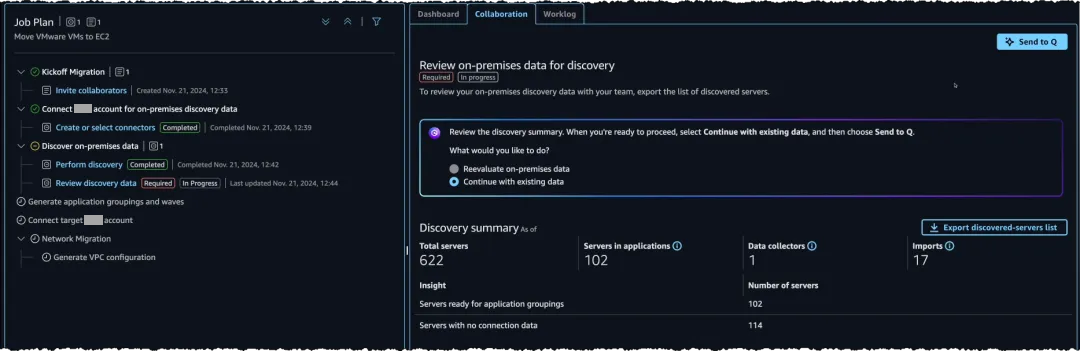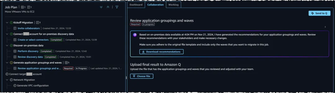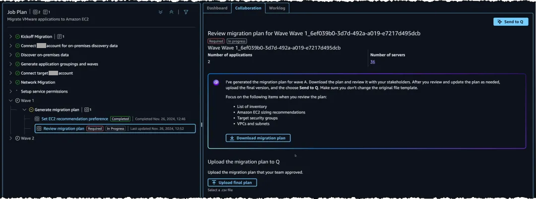 典型的VMware迁移任务包括数据发现、应用程序分组、网络迁移和服务器迁移等步骤。随着任务的推进,Amazon Q Developer会根据不断的学习动态更新任务计划,并添加新的步骤。