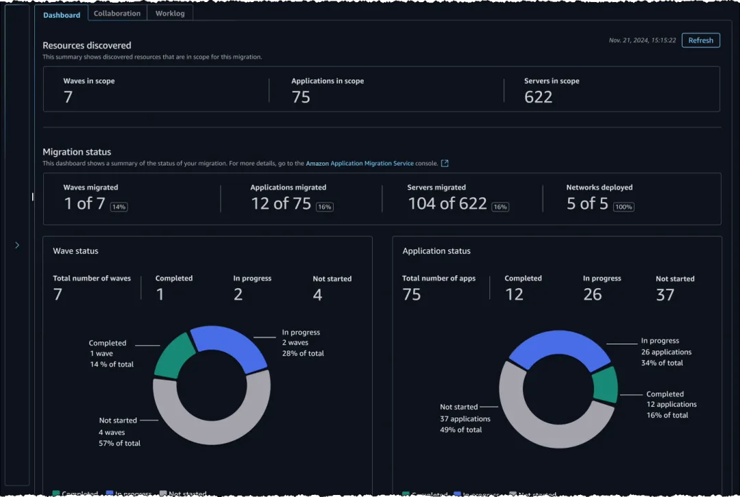 在迁移过程中,您可以使用仪表板跟踪观察整体转换进度,包括网络部署状态以及各个服务器和波次。