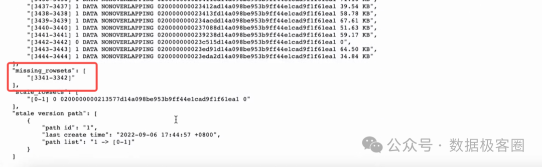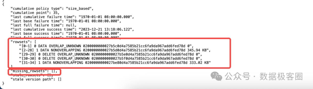 查看该副本的rowset 和 missing_rowset ,重点看rowset 的最大版本(这里是34)和 missing_rowsets,从这里可以看出该副本的rowset 为 0 ~ 34, 且中间不缺version(missing_rowsets为空)。